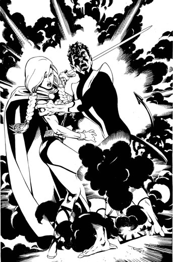 Although both Wolverine and Captain Canuck make their Common Elements debuts in this artwork, it marks Dave Ross’s second entry into my ever-expanding theme series. Dave’s first creation for the Common Elements gallery was “Wagnerian Opera,” this stunning panel featuring one of my favorite heroines, the Valkyrie, alongside Wolverine’s X-Men compatriot Nightcrawler. Legendary inker Joe Rubinstein supplied the finishing touches.