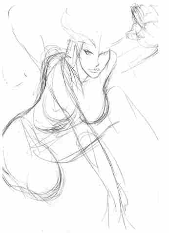 Buzz’s finished Vixen image evolved from his second stab at the drawing. He spent quite a bit of time puzzling out exactly how he wanted to compose the shot — given the nature of the character, he wanted a look that read both beautiful and feral. He’d actually begun sketching out a pose before he decided to start over from scratch. Rather than erasing his initial rough, Buzz flipped the board over and resumed drawing on the opposite side. Which means, of course, that his first attempt remained intact on the reverse.